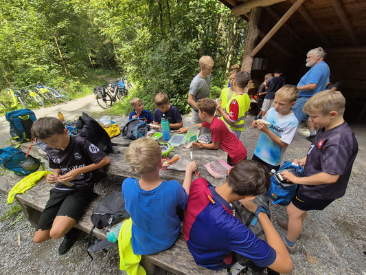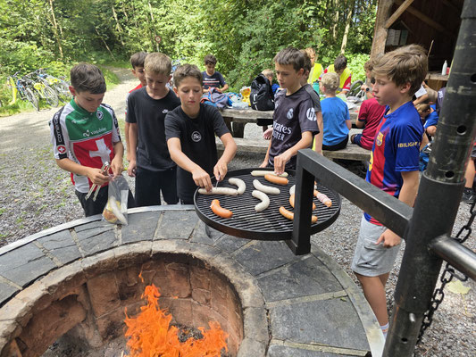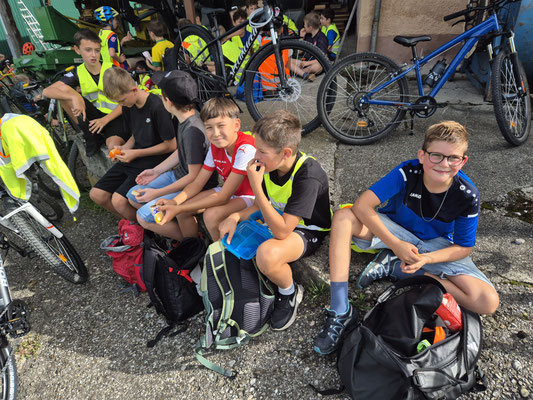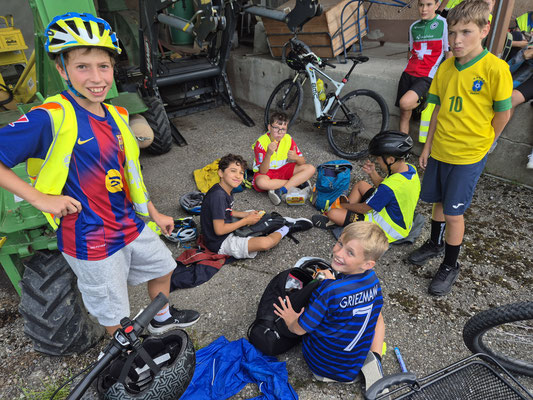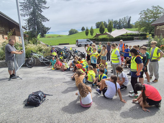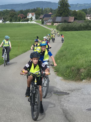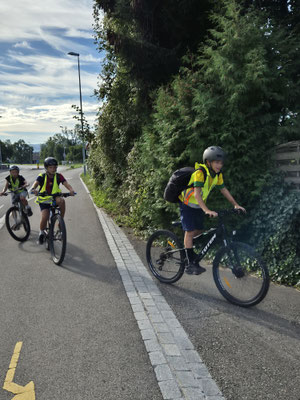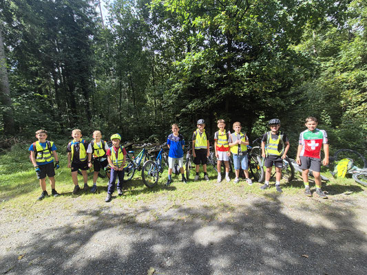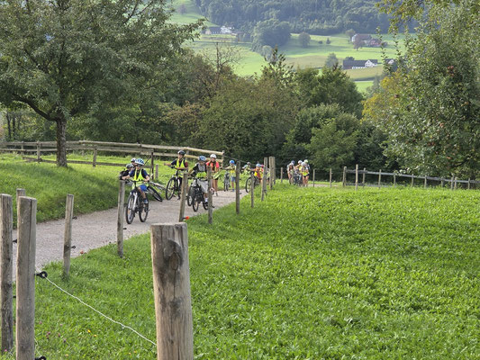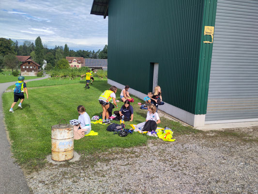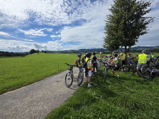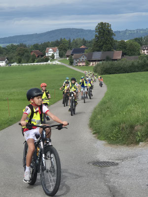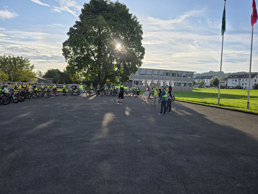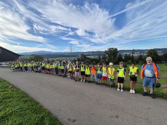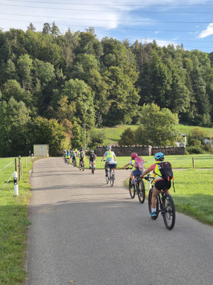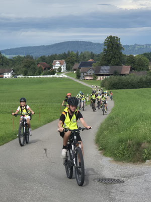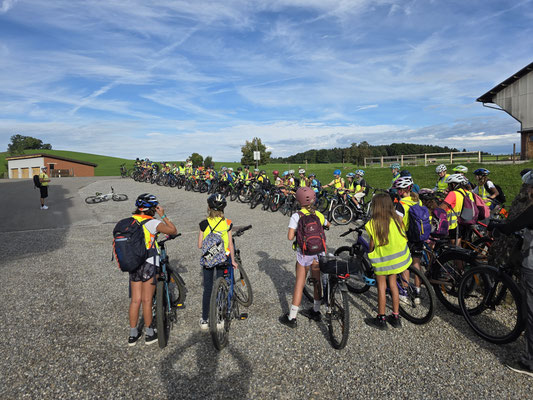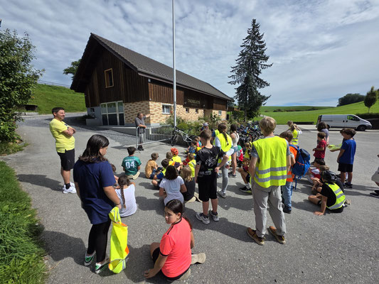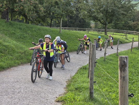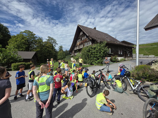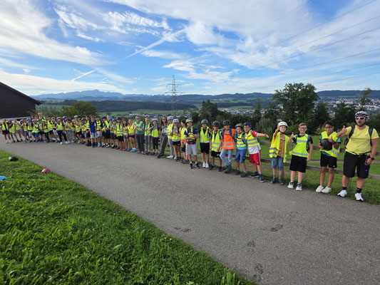 Da das Wetter beim zweiten Ansetzungsdatum vom letzten Donnerstag, 4.9.2025 optimal mitspielte, konnten wir uns mit viel Vorfreude auf die Gemeindegrenzumfahrung machen. Mit 45 Kindern und 5 Begleitpersonen setzte sich der Tross gleich zu Beginn über die Billwilerbrücke Richtung Staubhausen auf einen anstrengenden Anstieg in Bewegung. Beim Zwischenhalt beim Kloster erfuhren wir etwas über die Geschichte der Gemeinde und wurden auf die Abfahrt des Klosterstichs vorbereitet. Nach der Umfahrung des Sonnentals fuhren wir entlang der Glatt bis zu den Überresten der Glattburg. Dort empfing uns Ernst Brunner. Er erzählte uns einige historische und persönliche Geschichten zu diesem besonderen Ort der Gemeinde. Anschliessend führte er uns noch auf seinen Hof, wo wir das älteste Haus auf dem Gebiet der Gemeinde bestaunen durften. Zum Schluss versprach er uns noch nach dem Bräteln bei der Mittagsrast im Nutzenbuecherwald eine Glacé «Tschelatti» aus seiner eigenen Herstellung. Herzlichen Dank an Ernst Brunner für den köstlichen Dessert. Vielleicht geht ja mal jemand privat bei ihm zum Dessert in der Glattburg vorbei. Zuerst galt es aber noch den höchsten Punkt der Gemeinde den Sidenberg an der Gossauer Grenze anzufahren. Auf einem wunderbaren Feuer konnten wir unsere Würste und Käse bräteln und uns genüsslich erholen. Satt und glücklich von der gemütlichen Zeit und Spiel setzten wir uns unseren Weg Richtung Niederwil fort. Dabei hatten wir leider einen Sturz zu beklagen. Trotzdem ging es steil abwärts Richtung tiefstem Punkt der Gemeinde an der Thur. Die Müdigkeit machte sich immer mehr bemerkbar und wir waren froh, schliesslich wieder bei der Schule anzukommen. Mit grossem Jubel honorierten wir schliesslich unsere tolle Leistung. Die Strapazen über 30 Kilometer und einigen Höhenmetern macht uns stolz und zeigte, was wir zusammen und mit positiver Herangehensweise alles schaffen können. Das Erlebnis wird uns sicher in Erinnerung bleiben.