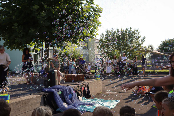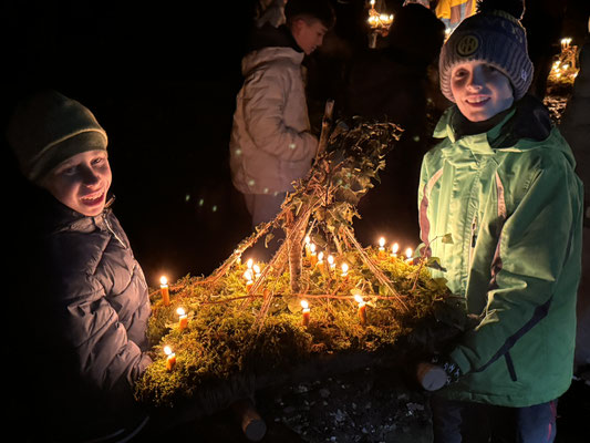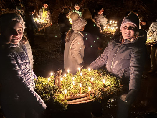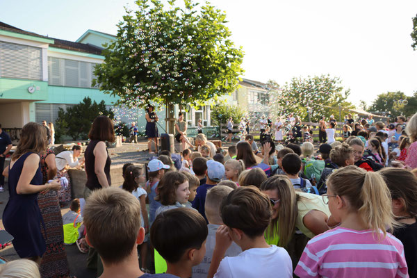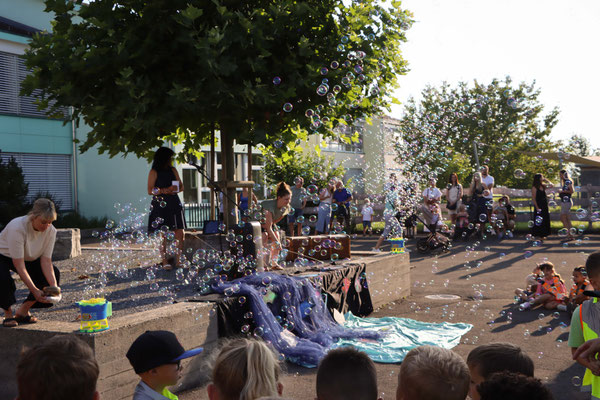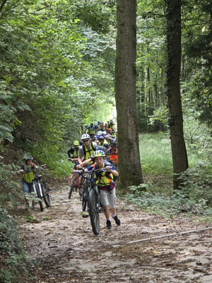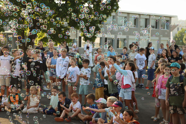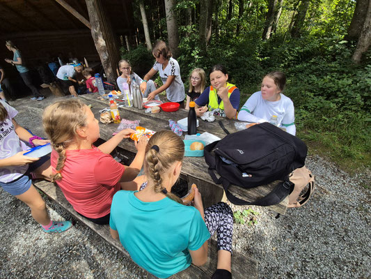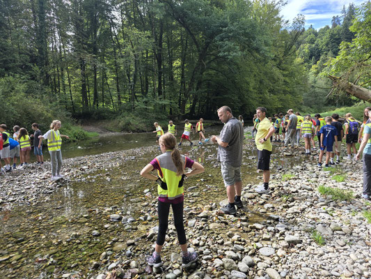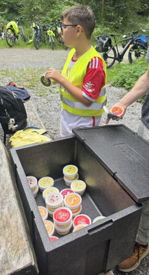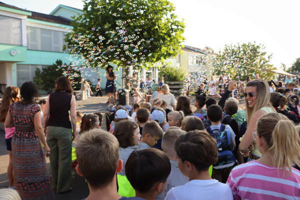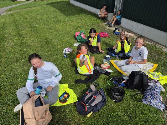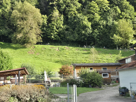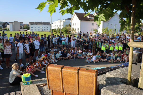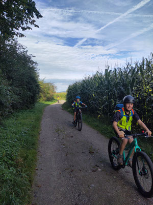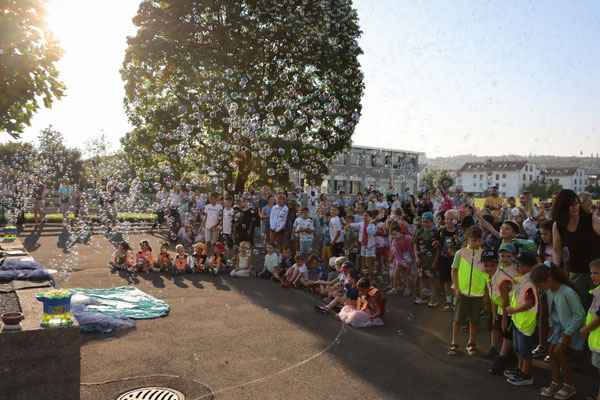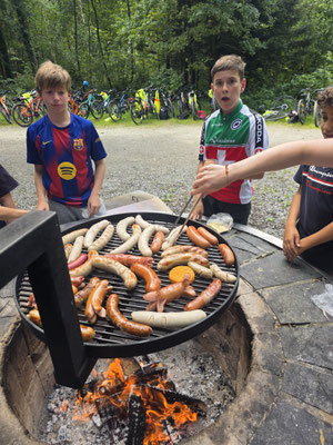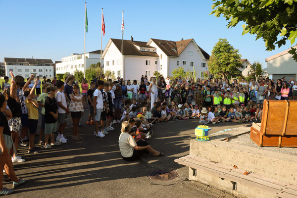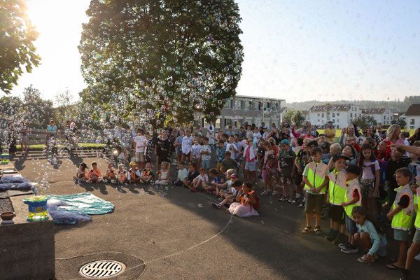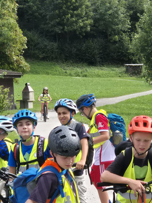 Da das Wetter beim zweiten Ansetzungsdatum vom letzten Donnerstag, 4.9.2025 optimal mitspielte, konnten wir uns mit viel Vorfreude auf die Gemeindegrenzumfahrung machen. Mit 45 Kindern und 5 Begleitpersonen setzte sich der Tross gleich zu Beginn über die Billwilerbrücke Richtung Staubhausen auf einen anstrengenden Anstieg in Bewegung. Beim Zwischenhalt beim Kloster erfuhren wir etwas über die Geschichte der Gemeinde und wurden auf die Abfahrt des Klosterstichs vorbereitet. Nach der Umfahrung des Sonnentals fuhren wir entlang der Glatt bis zu den Überresten der Glattburg. Dort empfing uns Ernst Brunner. Er erzählte uns einige historische und persönliche Geschichten zu diesem besonderen Ort der Gemeinde. Anschliessend führte er uns noch auf seinen Hof, wo wir das älteste Haus auf dem Gebiet der Gemeinde bestaunen durften. Zum Schluss versprach er uns noch nach dem Bräteln bei der Mittagsrast im Nutzenbuecherwald eine Glacé «Tschelatti» aus seiner eigenen Herstellung. Herzlichen Dank an Ernst Brunner für den köstlichen Dessert. Vielleicht geht ja mal jemand privat bei ihm zum Dessert in der Glattburg vorbei. Zuerst galt es aber noch den höchsten Punkt der Gemeinde den Sidenberg an der Gossauer Grenze anzufahren. Auf einem wunderbaren Feuer konnten wir unsere Würste und Käse bräteln und uns genüsslich erholen. Satt und glücklich von der gemütlichen Zeit und Spiel setzten wir uns unseren Weg Richtung Niederwil fort. Dabei hatten wir leider einen Sturz zu beklagen. Trotzdem ging es steil abwärts Richtung tiefstem Punkt der Gemeinde an der Thur. Die Müdigkeit machte sich immer mehr bemerkbar und wir waren froh, schliesslich wieder bei der Schule anzukommen. Mit grossem Jubel honorierten wir schliesslich unsere tolle Leistung. Die Strapazen über 30 Kilometer und einigen Höhenmetern macht uns stolz und zeigte, was wir zusammen und mit positiver Herangehensweise alles schaffen können. Das Erlebnis wird uns sicher in Erinnerung bleiben.